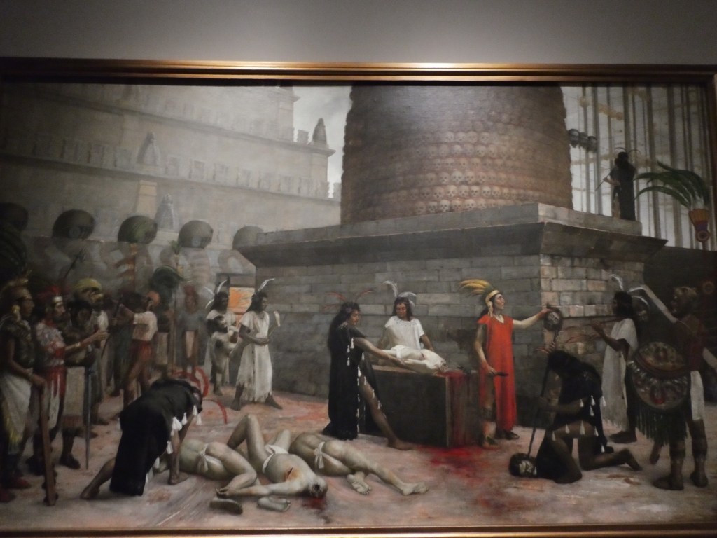 I started snapping my camera with the energy and enthusiasm of a paparazzi looking to upskirt Diana circa 1985. Next were two screens depicting the fall of Tenochtitlan. Conquistadors and Aztecs drowning, toppling from burning buildings, impaling or shooting each other … Such rich detail. Lots more paintings of the Eagle eating a snake on the cactus (what’s on their flag), cacti, maps, small statues, huge portraits of Montezuma. Even the landscapes were great – normally I am all about the portraits or paintings of people. Wow! And I hadn’t even hit the main collections yet! I entered the main courtyard to this powerful piece.