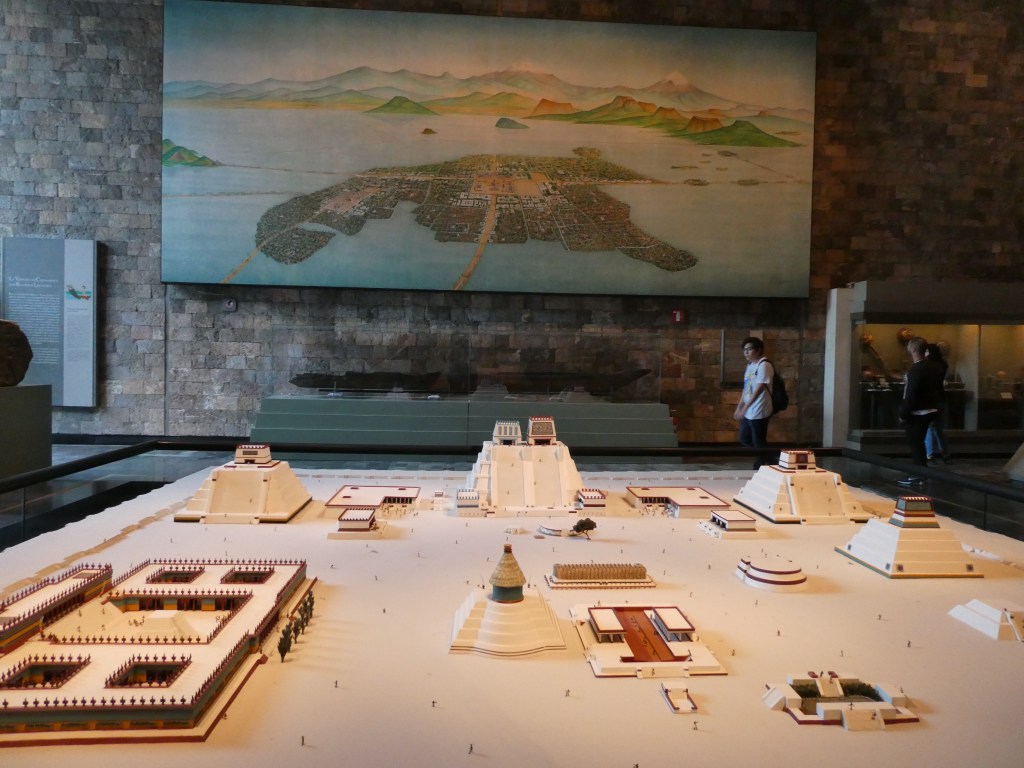 Tenochtitlan was built on a lake which is why it’s wonky. You can see theong causeways the Spaniards rose up. During the battle for the city that the Spaniards eventually won with the help of a little thing called smallpox, many conquistadors, horses, armour etc plunged right to the bottom of the lake off the causeways. A few were destroyed to cut off escape routes. You can also see the Templo Mayor on the model. Left is the Tlaloc side (water god), right is Huitzilopolit (war god) side. The Eagle warrior workout zone – perhaps like the Crows shed for the time? – is just next to it. Some of these buildings would be under the Metropolitan cathedral now.