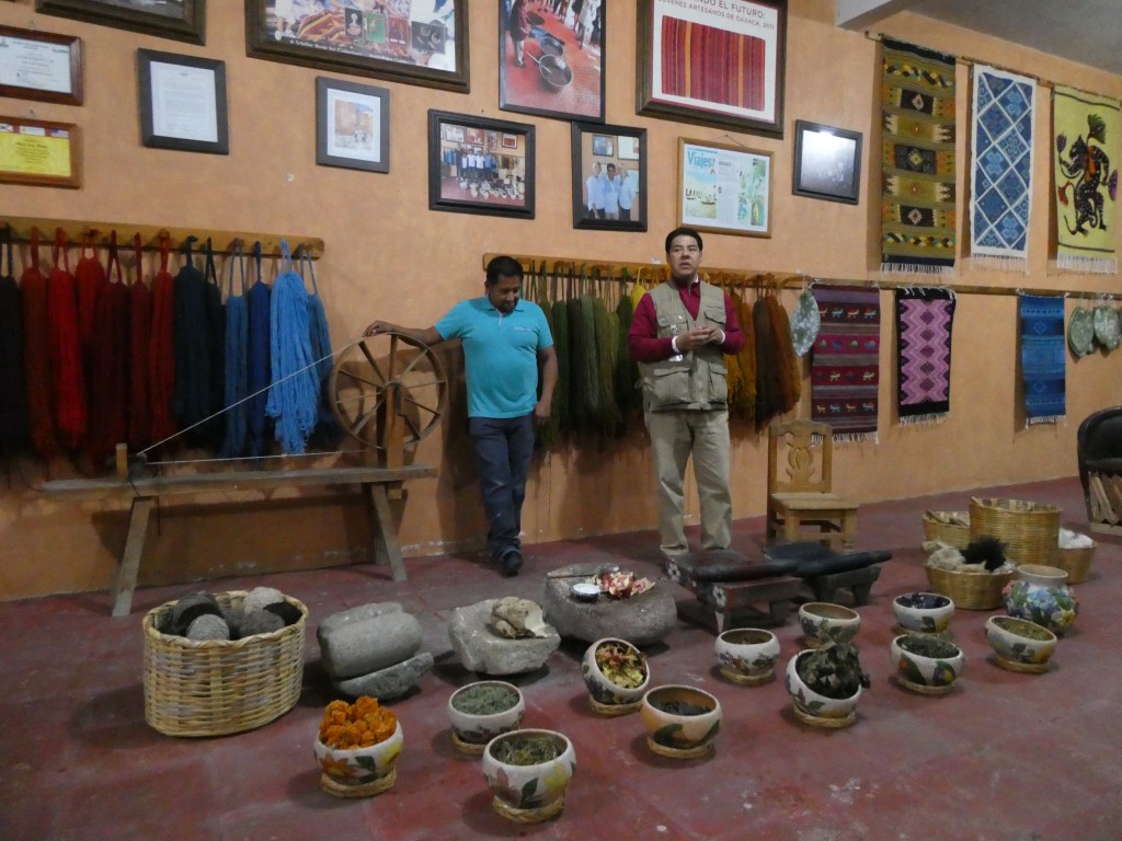 The fella showed us the plants and fabrics used to dye the textiles. The factory was quite famous for Disney reps visiting them to consult for the authenticity of fabrics depicted in the Coco movie. Another fun fact is that the men do the weaving, not the women. I have never seen that in any culture before. The machine was a beast!