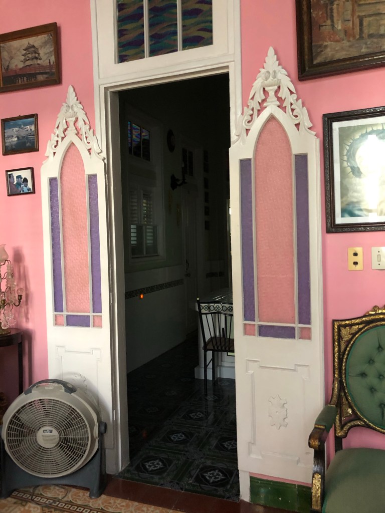 Junior dropped me off at La Vista Mar on Paula Street, around the corner from the very boringly named Cuba Street. The heavy rain had stopped but it was bleak and drizzling. A Cuban guesthouse is a bit like a bed and breakfast where the owner lives and/or staff make you breakfast. This one was a three storey townhouse with a rooftop terrace for breakfast. The living room was a merging of Jesus pictures with Victorian style furniture, pink walls, glassware, and a small framed photo of Fidel Castro.