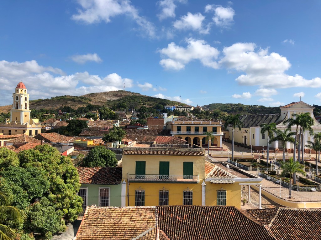 View across Trinidad with Revolutionary museum on the left, square and cathedral on the right and romantic museum next to the cathedral.