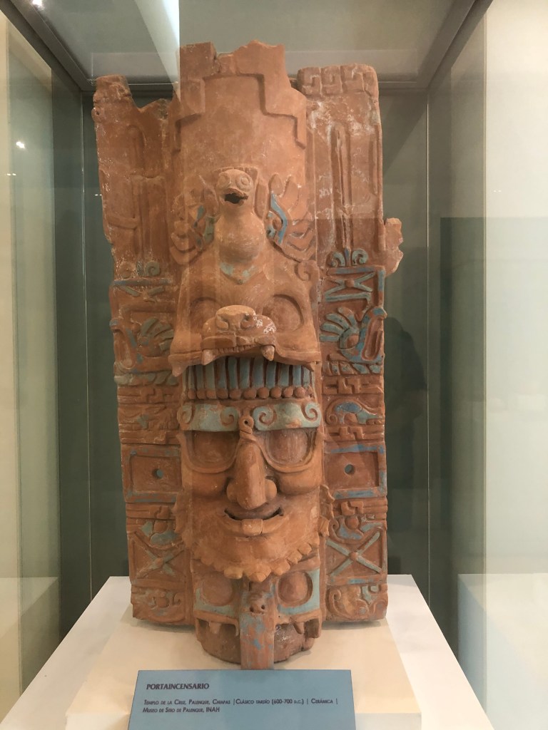 The museum was awesome!!!!! First, it was a long walk up an external circular ramp up to the very top of the building to a singular doorway. To the right was a section on the Maya in general. It was the very model of a modern Maya general! (I really hope somebody got that one …) No hablo English captions but I hit on the brilliant idea of brandishing Google Translate in front of the Spanish captions. The Spanglish danced before my eyes like sugar plum fairies but helped me figure out what each artifact was. Stoked! The sections were the standard ones on the material culture of war, death rituals, astronomy and other bits pulled from buildings and I loved it all!!!! I was a particular fan of these braziers.