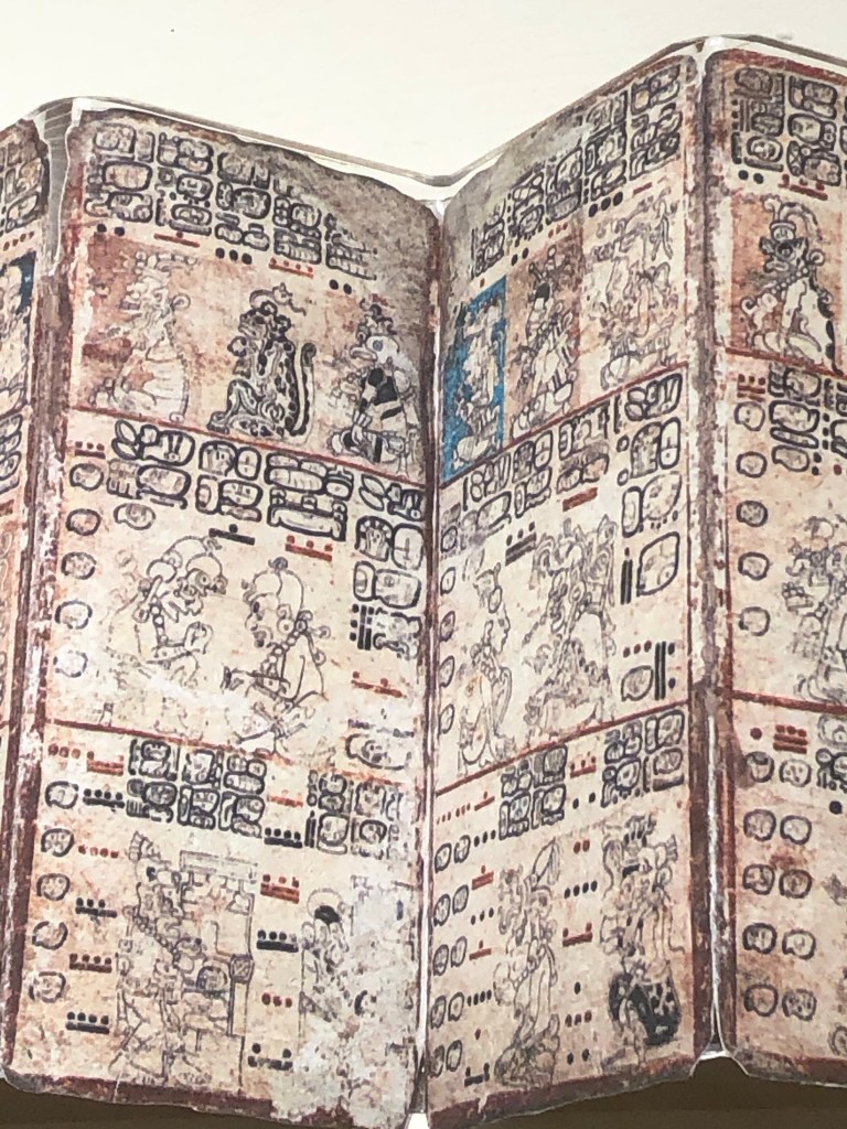 Oh boy, was I excited to see the next room! An exhibit of MesoAmerican codices on a road trip from the National Museo of Anthropology! These rare Aztec and Mayan texts explain things like creation or migration history. They are rare because the Spaniards burnt as many as they could find in the interests of converting them to Catholicism. The Dresden Codex (named after the city where the ancient text is located – this one is probably a facsimile) is one of four ancient Mayan codices to survive the enlightenment of the Spaniards. It’s a bit of a Rosetta Stone for Mayan glyphs with linguistic experts using it to crack the meaning of the Mayan numerals and short /long count calendar. It contains ceremonial information, astrological tables and 134 representations of Chac, the rain god. So another Chac attack like at Uxmal and Kabah! Baby got Chac? (I am here all week, try the veal …)