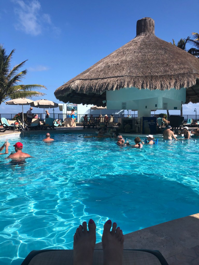 It was time to explore the resort. I walked around the pool area, checked out the massage area, saw shuffleboard tables, and walked on some mysterious green stuff that felt like mini-golf surface. I could see the beach from the weird green AstroTurf. All the spots were taken. Back to the pool. I saw a lounge and sat there. I noticed everybody was sporting blue pool towels. I was the only sad loser carting a white shower towel from my room. This is how infrequently I swim or hang out poolside. I have no idea of etiquette. Where did these blue towels come from????
