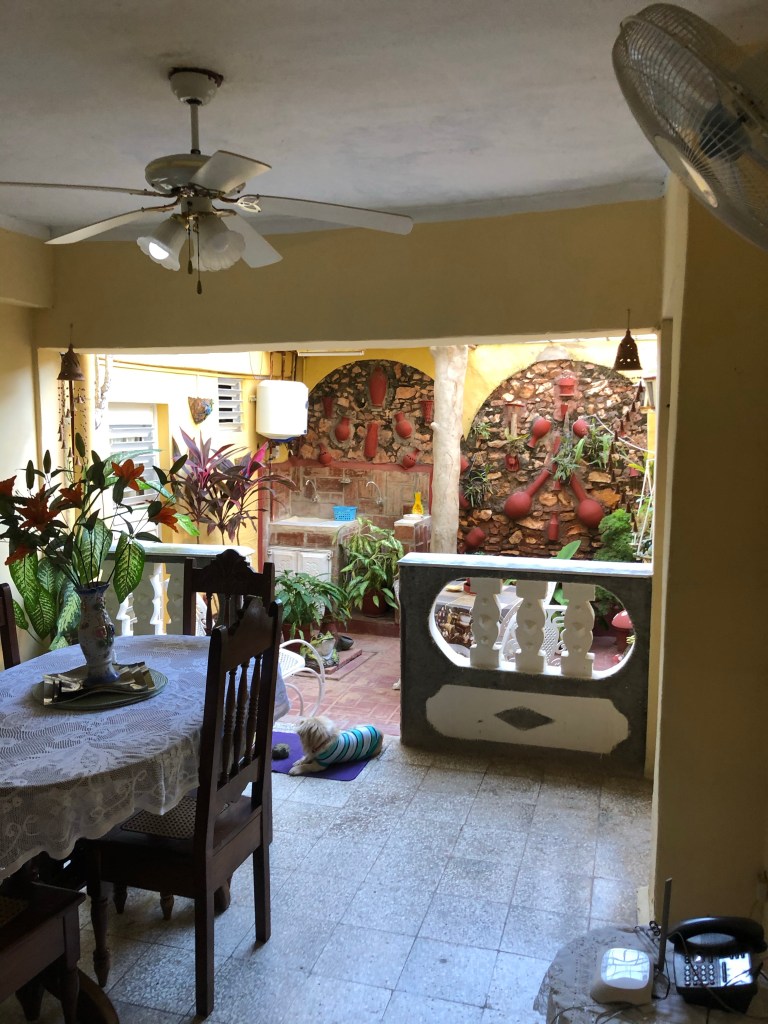 Then we headed for our casa particular (b n b ) to check in. This was a lovely little place with an indoor garden and tiny pool. Two dogs and a tiny puppy who couldn’t have been more than ten weeks old. The dining room contained old photos of the building and the neighbourhood, old deco china and glass cabinets (the kind Granny has).