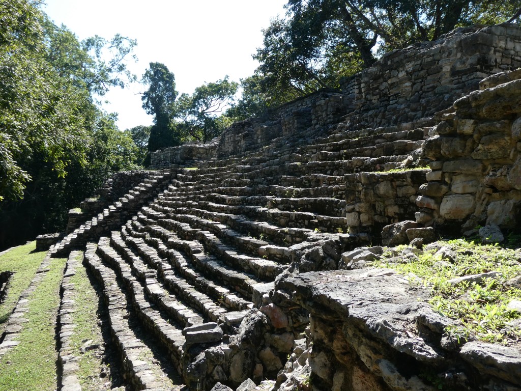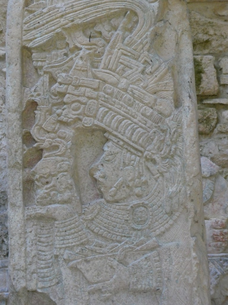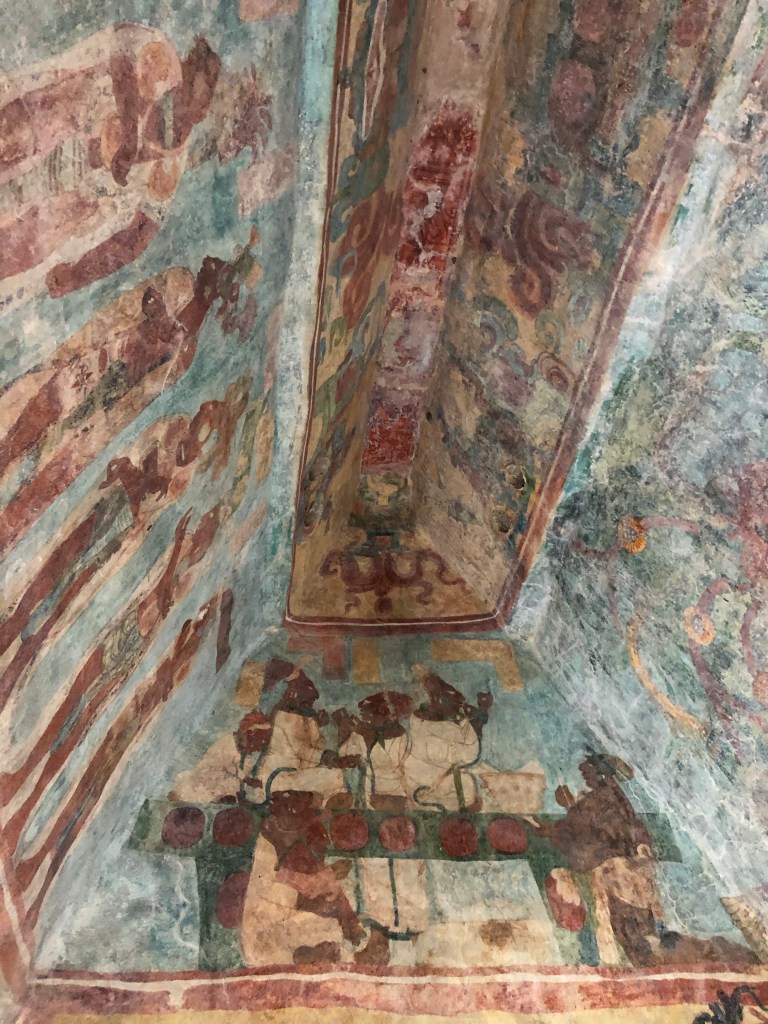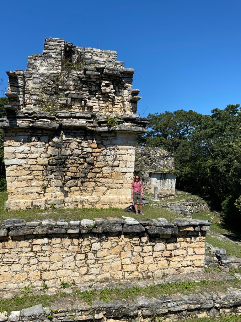 Rosalita led us to the not so world famous Laconda ruins which consisted of one structure on top of a hill. Another observation Edificio???? Manuel reported that this was all that remained of another Mayan city. It was probably a day’s walk from Bonampak which would have been a doddle for the Mayans who walked sacbes (white roads) for trade and other purposes. Could the actual people depicted in the Bonampak murals have sat on the edge of this very structure like I was right then? I had no way of dating the Lacondan building to know if it was contemporary with the murals (790 AD), but it was extremely cool to feel connected to the people in the murals in that particular moment. The vibe was very tranquil, looking out into the dense jungle. We sat there chilling and briefly forgetting about killer mutant flies.